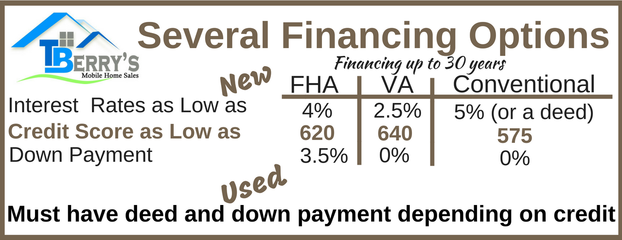 FHA Financing - Interest rates as low as 4%. Up to 30-year financing with 3.5% down. VA Financing - Interest rates as low as 2.5% - 30 years financing with 0% down. Conventional - 5% down or a deed
